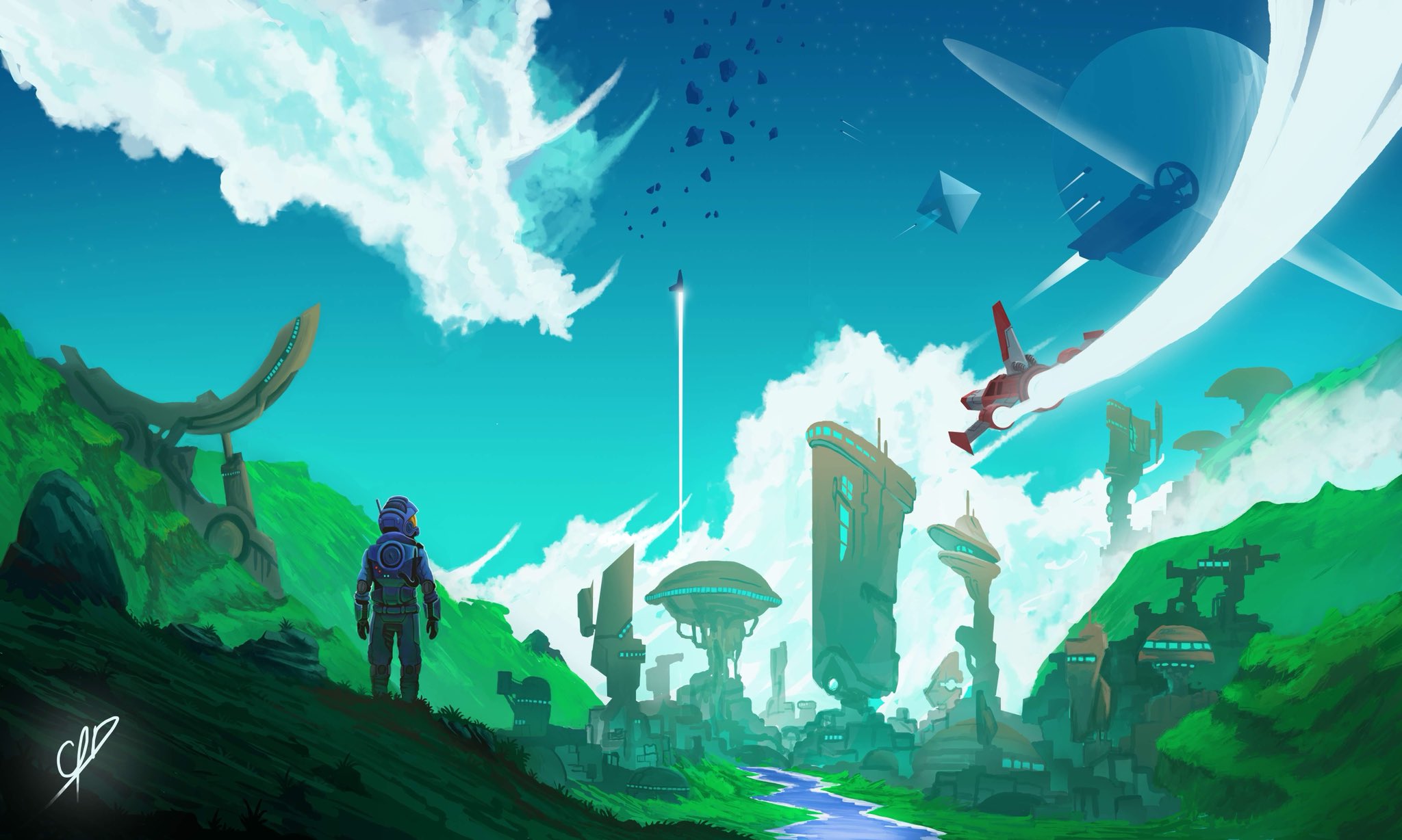 General 2048x1228 No Man's Sky planet space spaceship spacesuit clouds astronaut No Man's Sky NEXT sky fan art artwork science fiction video games rocket futuristic planetary rings